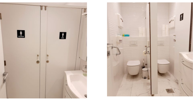 - V vseh toaletih (wc), ki so ločeni, moški in ženski za stranke, ter posebej ločeno za osebje, so dodatno nameščeni profesionalni medicinski dozatorji z posebno tekočino za razkuževanje toaletnih desk. Poleg njih so na zidu nad wc školjko nameščena držala za papirnate higijenske vložke za wc desko, ki jih daste po razkuževanju na wc desko predno se vsedete na njo. Prav tako so v vseh toalet (wc) prostorih koši za smeti in damske vložke ter tampone, ob katerih so nosilci za mini higijenske vrećke v kater date damsk vložke, tampone in vlažne dezinfekcijske brisačke.