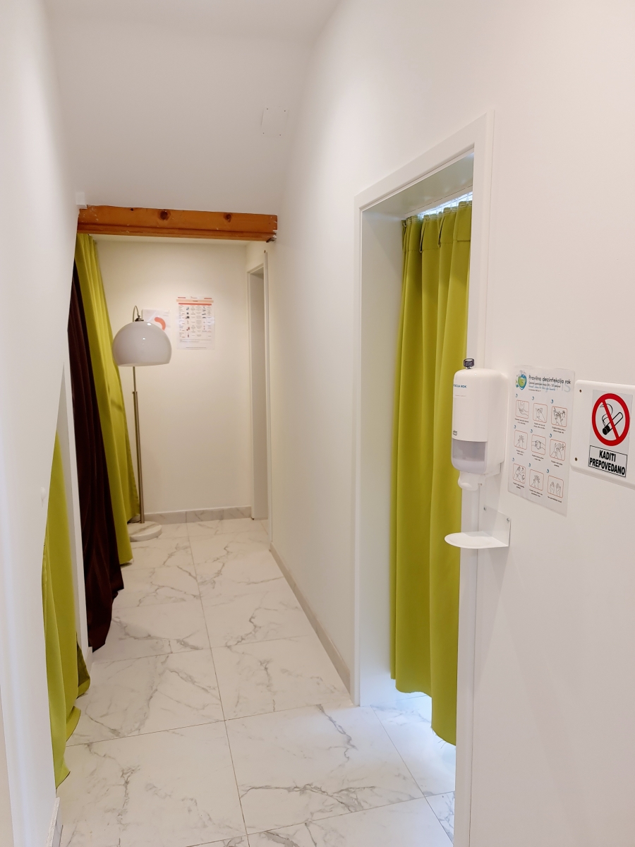 - Na vhodnih vratih ob vstopu so nameščeni nosilci za škatle v katerih so medicinske zaščitne maske in medicinske zaščitne rokavice vseh velikosti (XS, S, M, L, XL). Maske in rokavice so brezplačne. Lahko jih zadržite ali jih ob izhodu odvržete v ločena koša za smeti (za maske in rokavice).